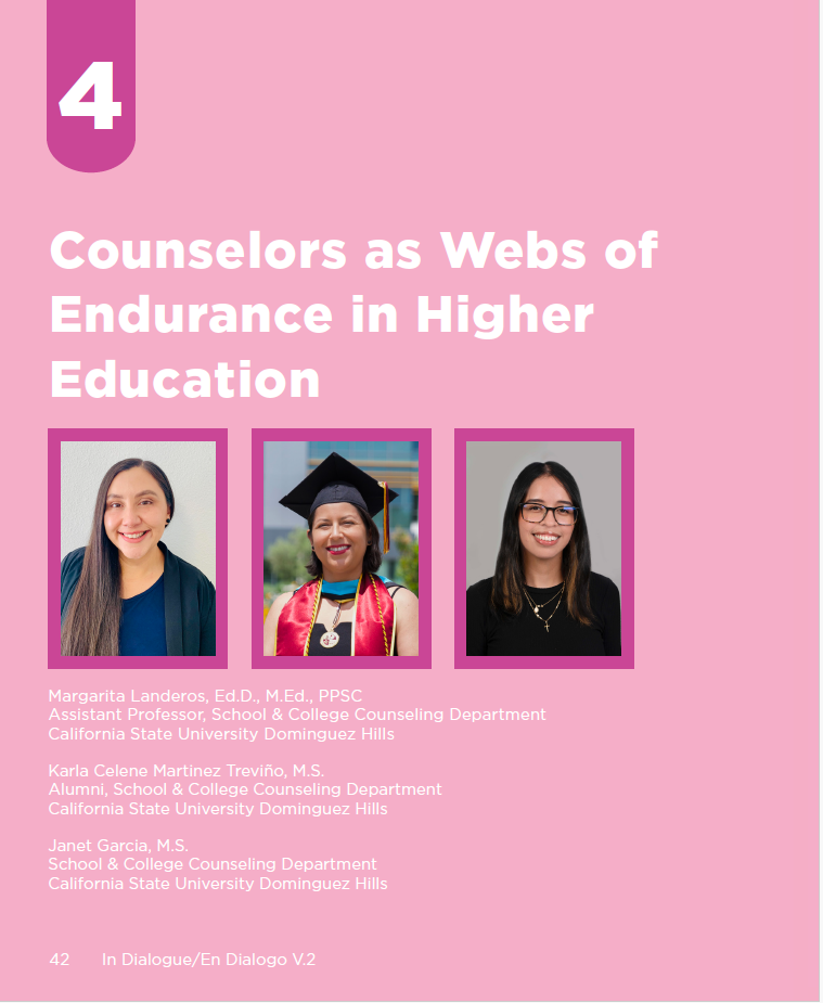 It is through the webs of solidarity which we form with colleagues, families, and community members, that we can find the strength to resist, fight back, and ultimately change the trajectory of our generation. This journal has created its own web of care as it brings intodialogue/diálogo the perspectives and leaders who shape our educational settings: students, teachers, counselors, researchers, practitioners, and community members. In this issue, juntos, we want to extend the ideology of comadrerismo, to harness its spirit and attempt to describe our newly created realities by webs of care, endurance, and solidarity which folks are creating to resist the ongoing assaults on our communities. In the following pages, we highlight experiences, contributions, and tejidos across K-16 that serve as testament to the endurance of our collective communities.